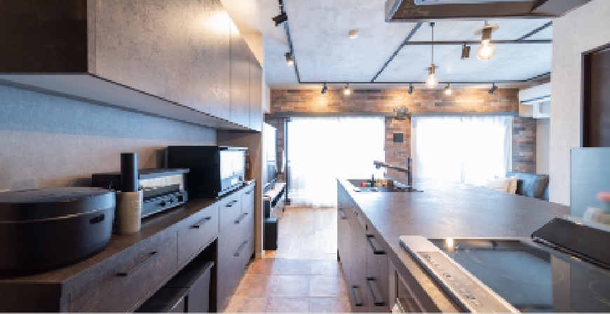 高機能メラミン素材のキッチン。エイジングしたコンクリートのような味わいでブルックリンスタイルとの相性も抜群。