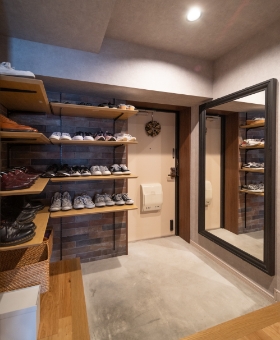 玄関はブルックリンスタイルには欠かせない、オープンシェルフの見せる収納に。「とにかく履く・戻すが楽です」とご主人様。大きな鏡は空間を広く見せるのに効果的です。