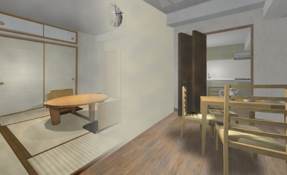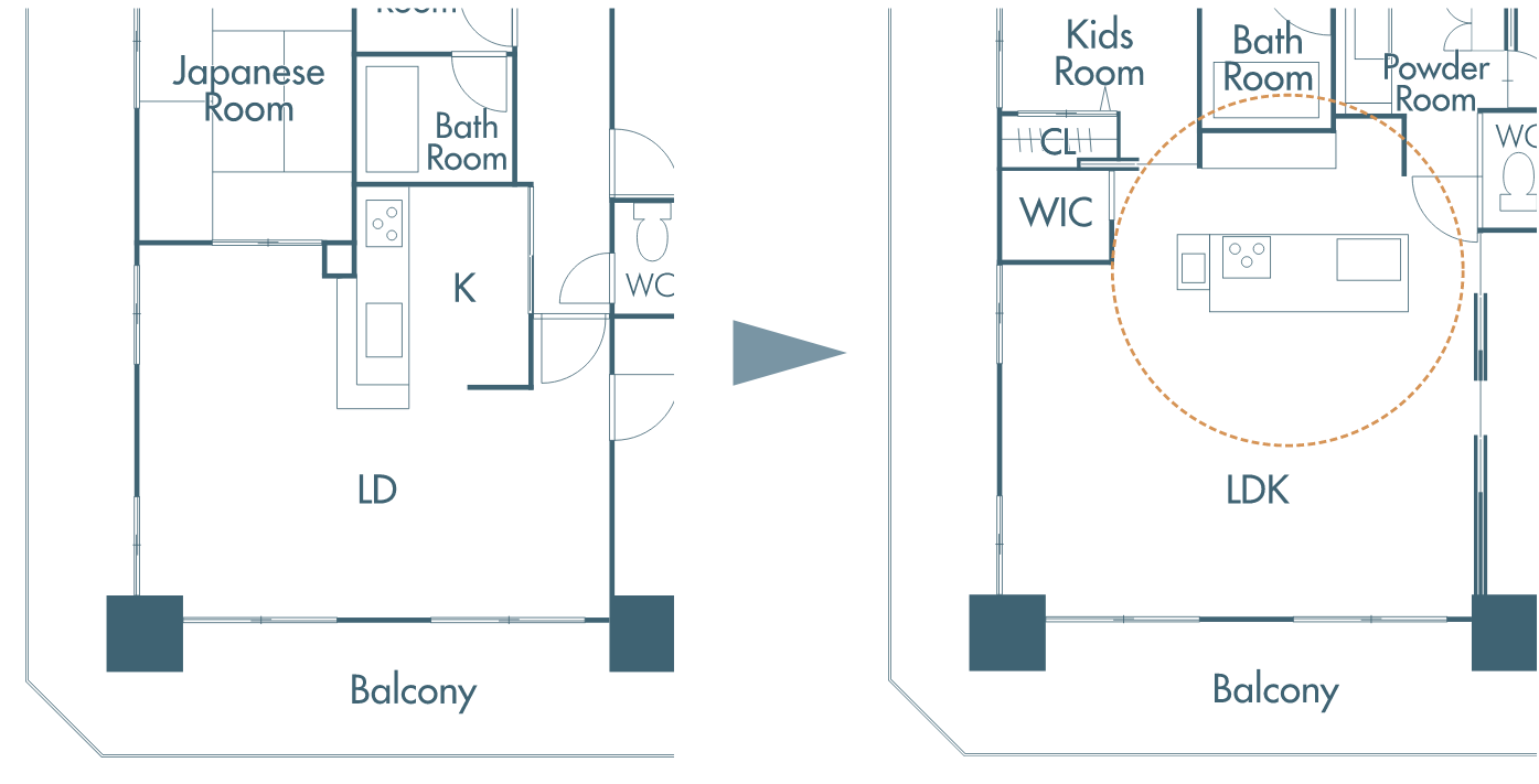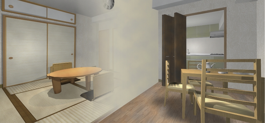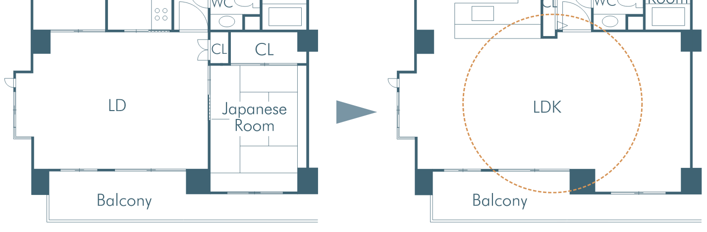 間仕切りで細かく区切られた部屋をひとつにして、のびやかなオープン空間が生まれます。